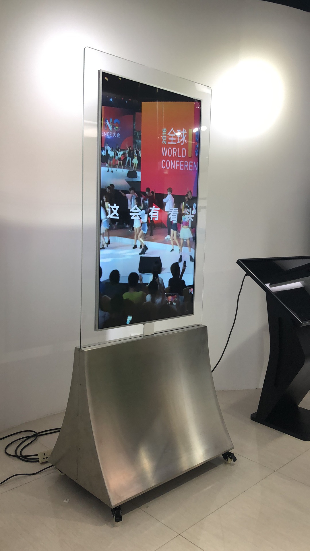 在In Glass OLED中,两个OLED面板背靠背放置,然后嵌入钢化玻璃框架内。由于周围的玻璃是透明的,它的显示器似乎是漂浮的,几乎在任何空间都需要注意。这两个面板能够播放独立的内容,在每一面显示不同的品牌或消息。