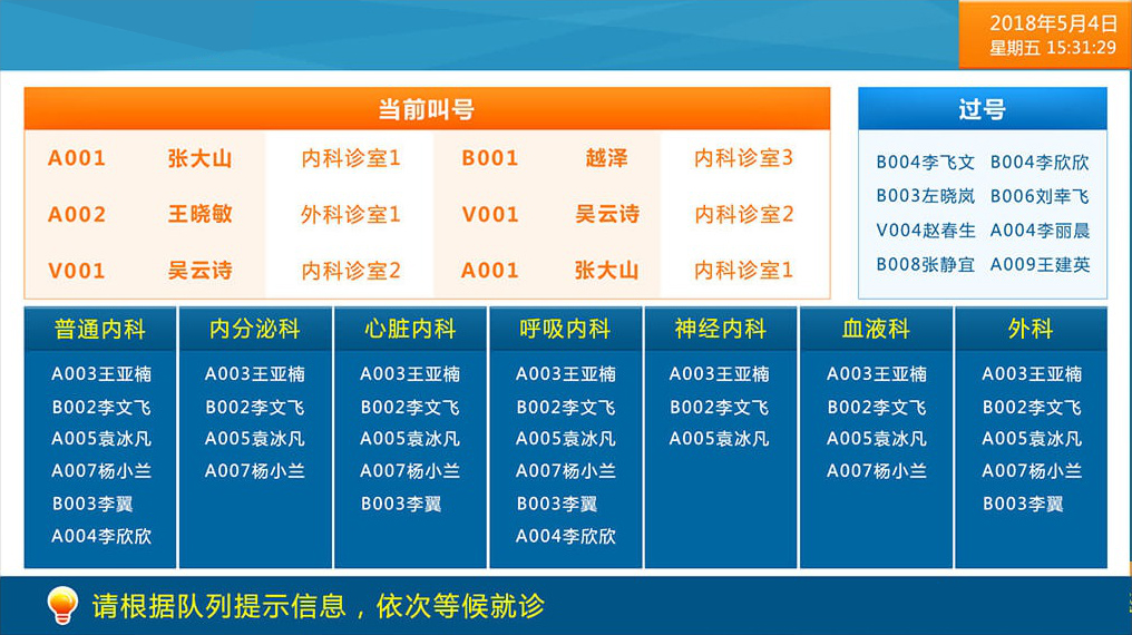 6、支持显示等候人员的排队号码、姓名和科室信息。